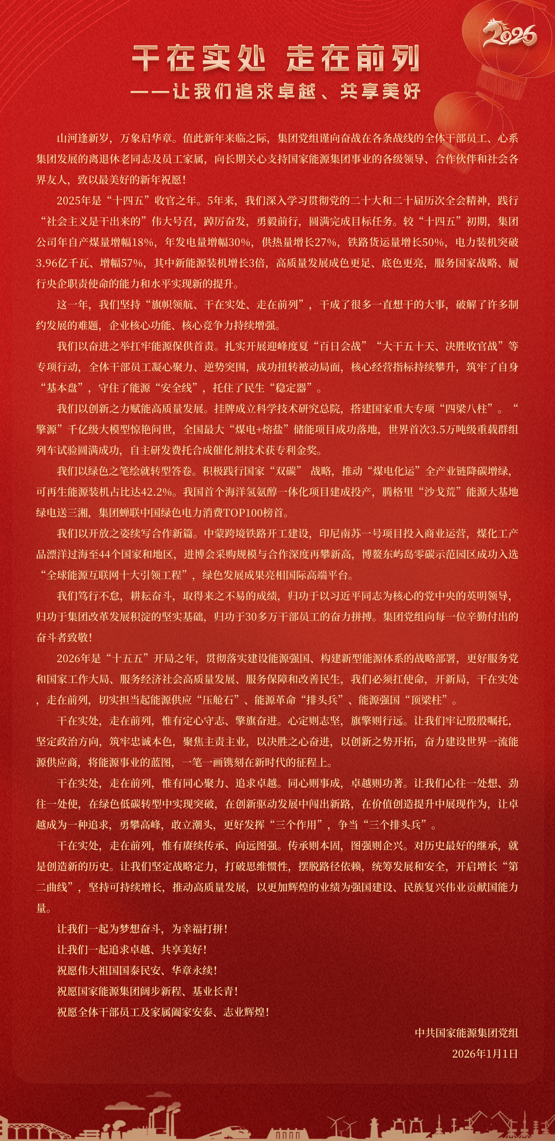 國家能源集團胸懷“國之大者”,增產增供、穩價穩市,積極服從服務國家戰略、保障國家能源安全、助力國民經濟穩增長,推動煤炭安全綠色智能、煤電清潔高效穩定、現代煤化工高端多元低碳、運輸物流協同一體、新能源多元創新規?;l展,全力擔當能源強國頂梁柱,能源供應壓艙石,能源革命排頭兵。